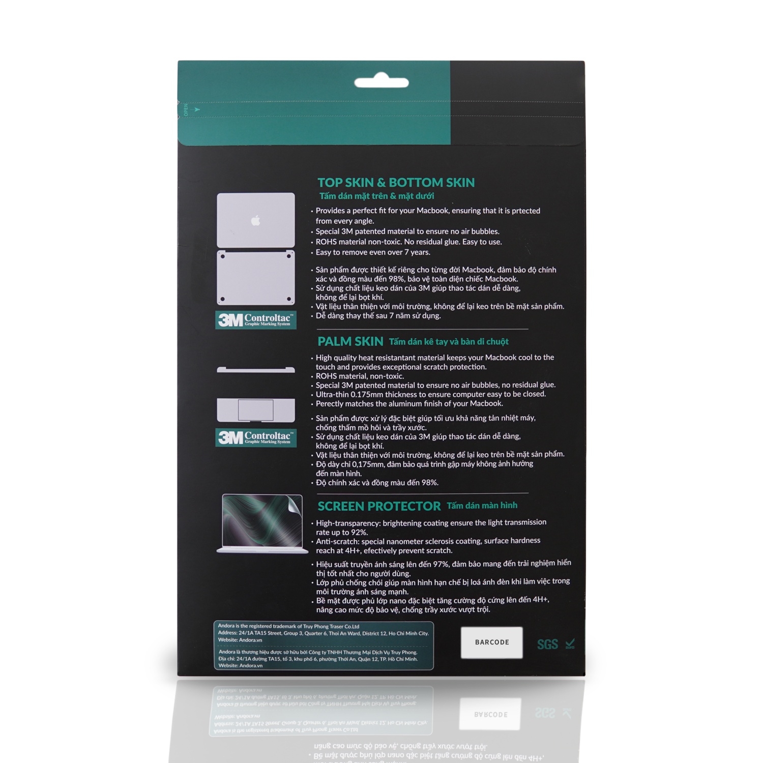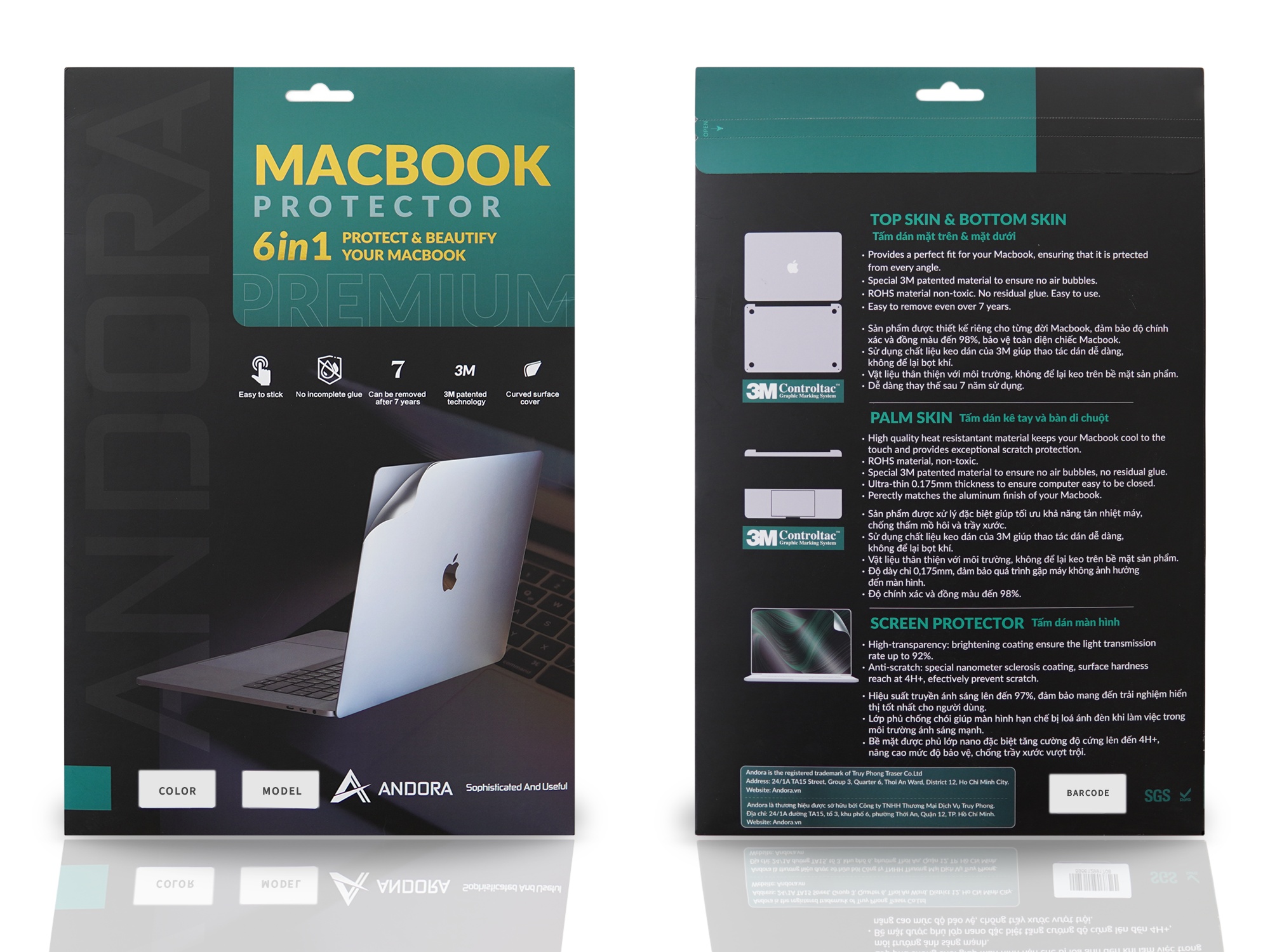Bộ sản phẩm Andora - Macbook Protector 5 in 1 bao gồm miếng dán bảo vệ mặt trên, mặt dưới, kê tay, trackpad và màn hình Macbook với những ưu điểm vượt trội sau: