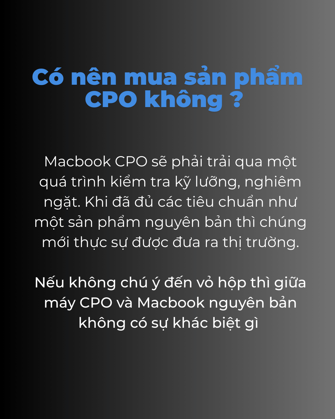 Macbook CPO (Certified Pre-Owned) là một thuật ngữ dùng để chỉ những chiếc Macbook được chính Apple tân trang một cách kỹ lưỡng, sửa chữa lần thứ 2 và bán ra thị trường.