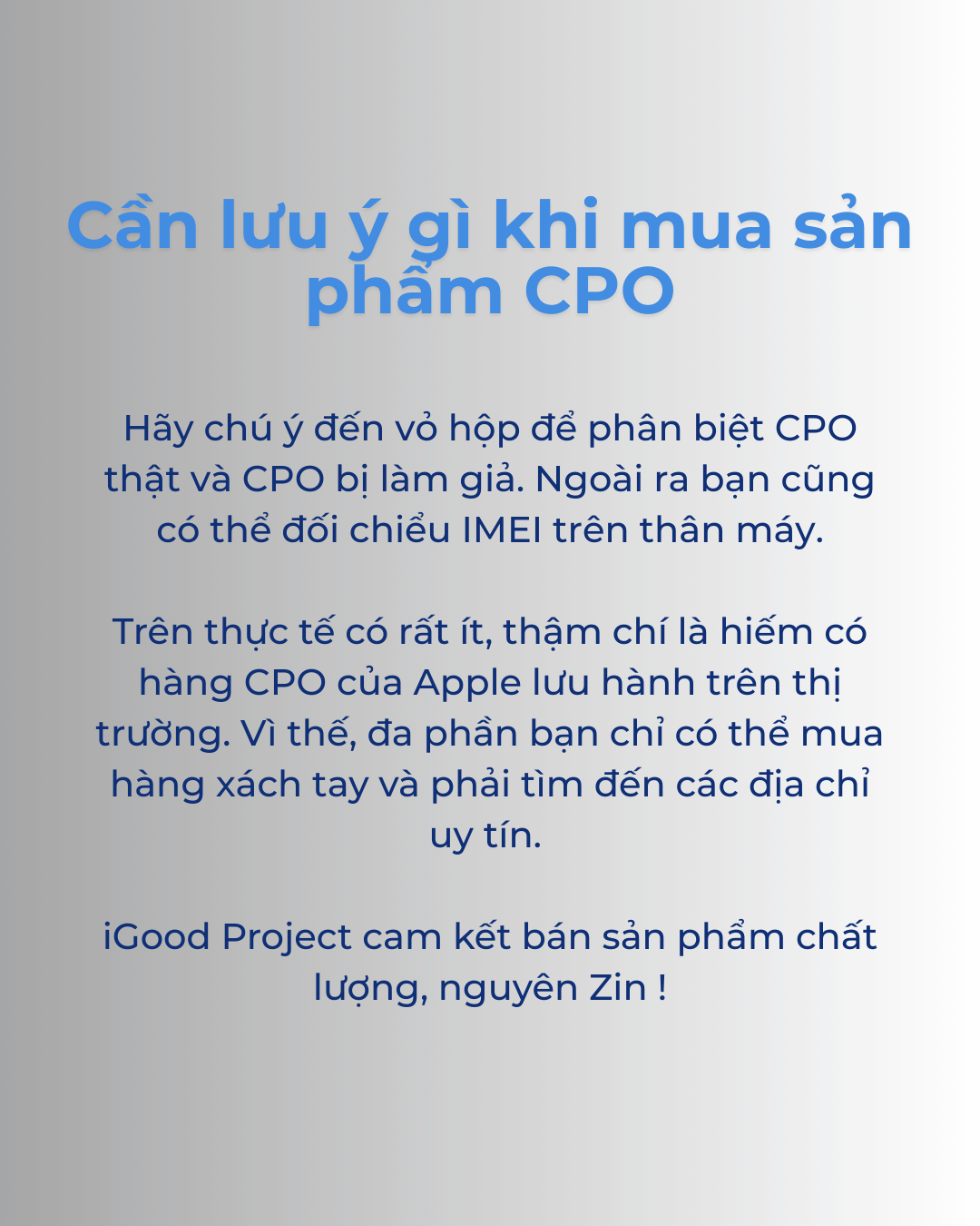 Điểm khác biệt của hàng CPO so với hàng Used (đã qua sử dụng) và hàng Refurbished (tân trang) chính là máy sẽ được thay mới hoàn toàn đối với các phần có dấu hiệu hư hỏng.
